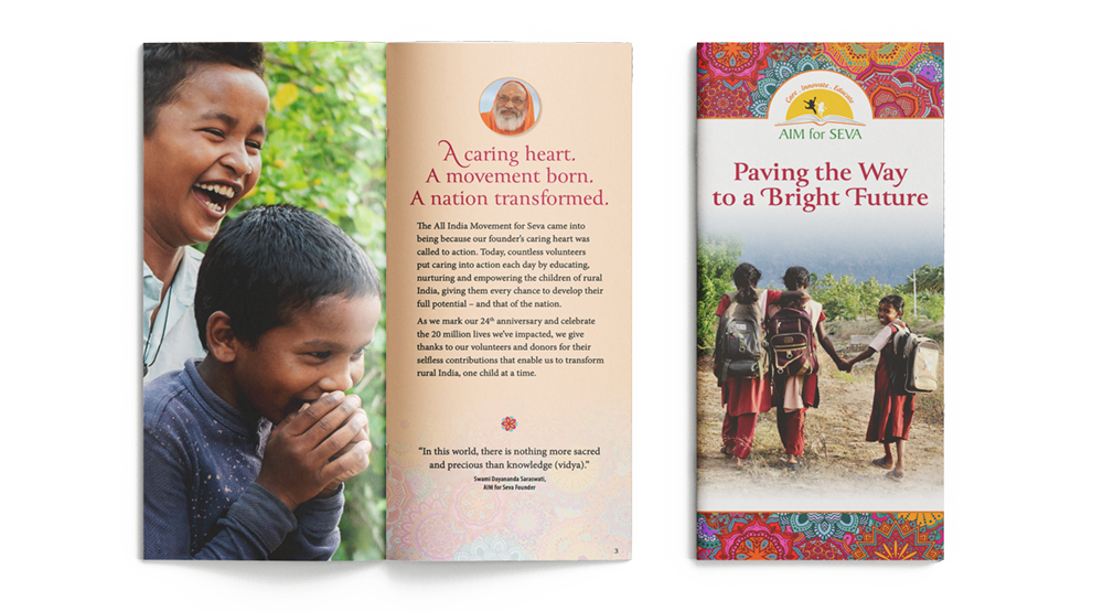 That same year, a colleague introduced AIM for Seva to Colleen Greene of Greene Marketing for help developing a capabilities brochure. As the project took shape, it became clear that the needs went beyond a single piece.